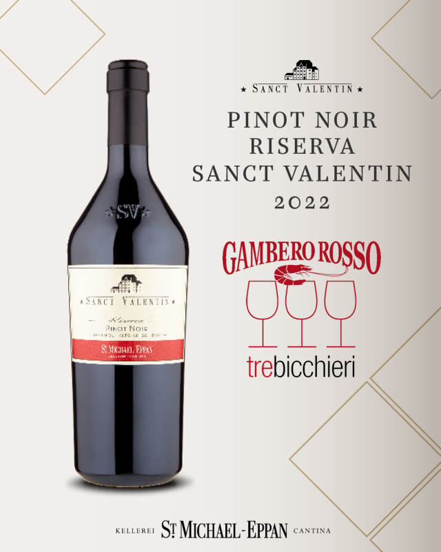 Siamo molto orgogliosi del massimo riconoscimento della rinomata guida Gambero Rosso: TreBicchieri per il nostro Alto Adige DOC Pinot Noir Riserva Sanct Valentin 2022! Grazie!